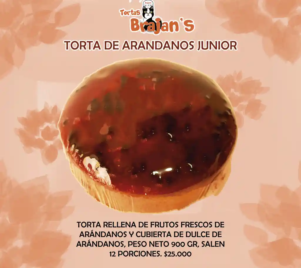 Torta rellena de frutos frescos de arándanos y cubierta de dulce de arándano, salen 12 porciones.