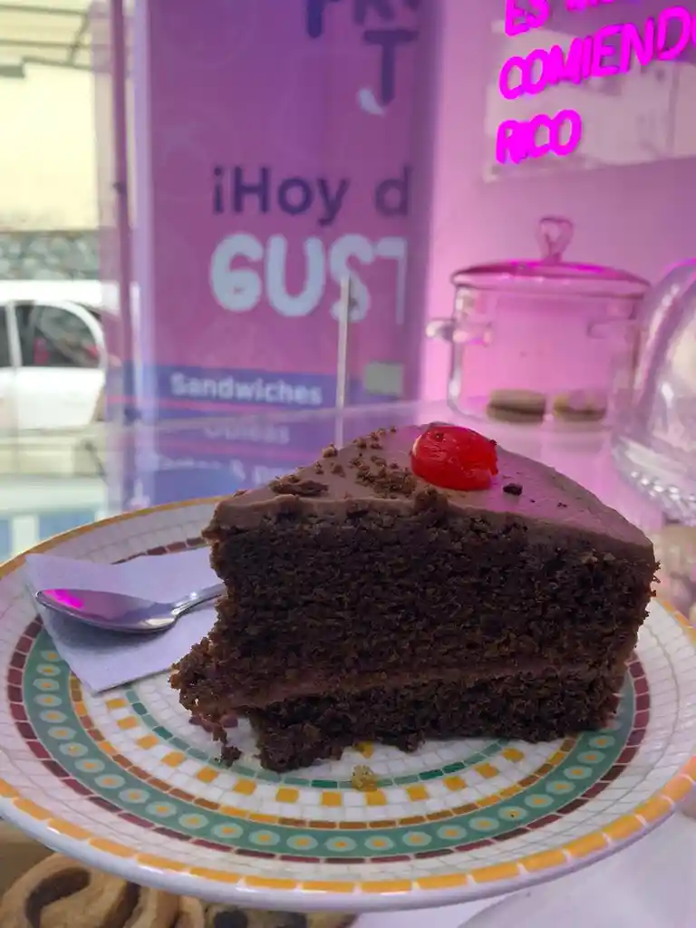 torta de chocolate húmeda, rellena de ganache de chocolate, cubierta de crema de chocolate y trozos de chocolate