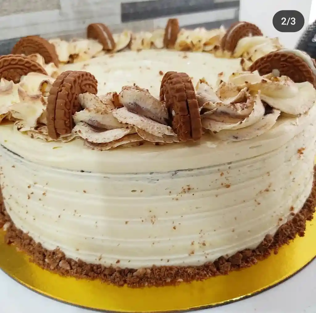 Torta 12/16 porciones de vainilla blanca, humedesida con el jarabe especial de la casa a base de 4 leches, con capa intermedia de arequipe, forrada en ButtyCream y blonda de lujo.