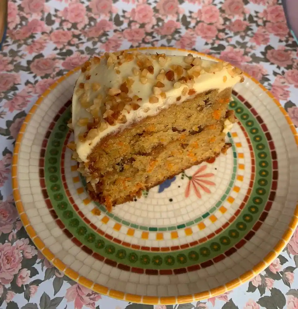 torta de zanahoria con trozos de nuez, rellena de dulce de leche, cubierta de frosting de queso crema y mani