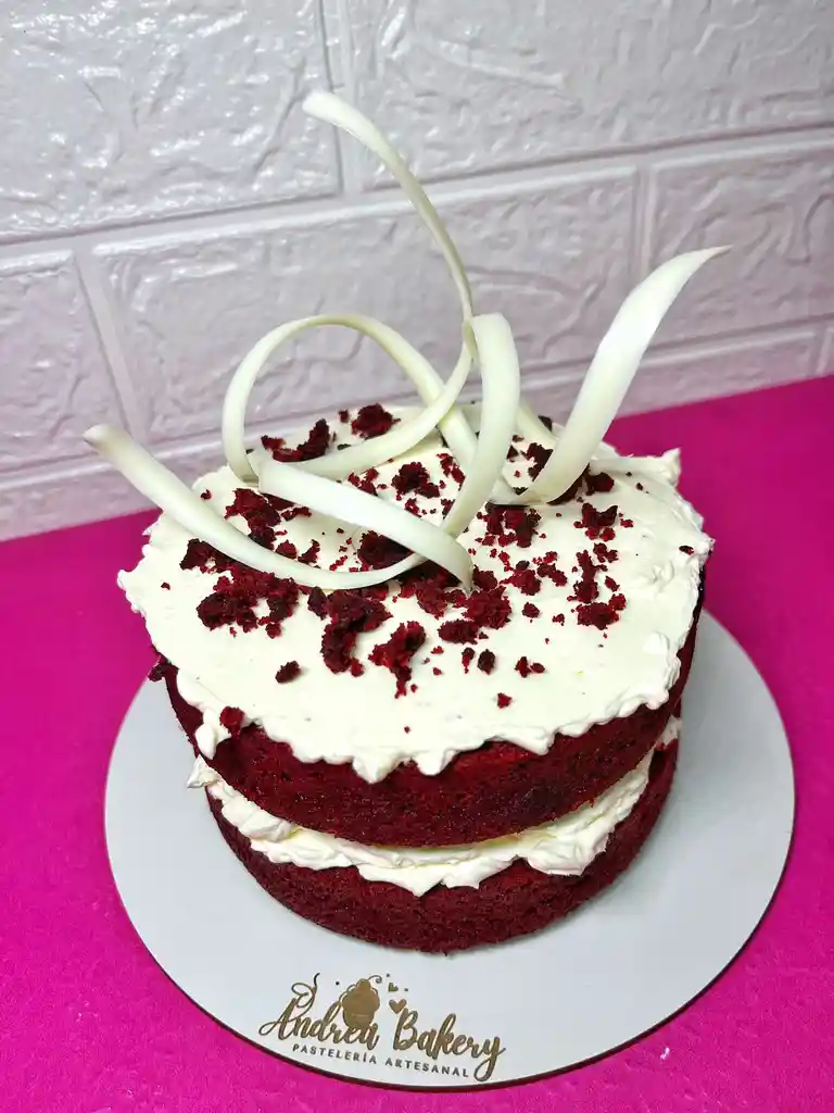 Deliciosa Torta terciopelada para compartir con relleno de Frosting de Queso y decoración en Chocolate blanco Incluye topper y vela