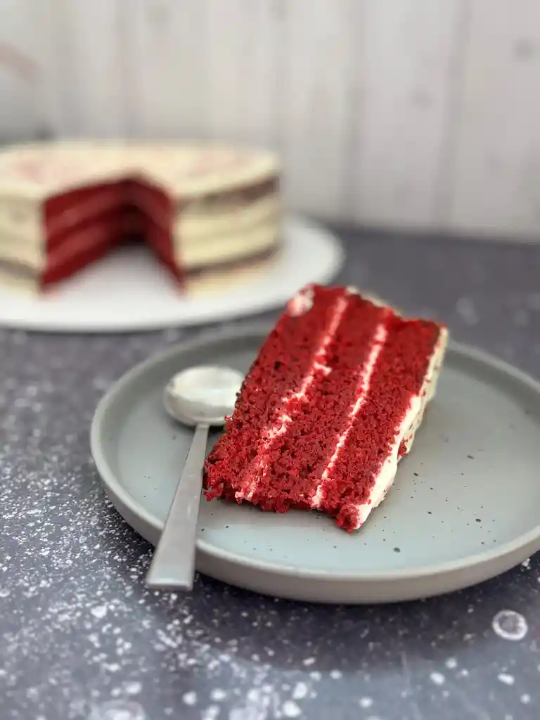 "Bizcocho rojo aterciopelado con suave frosting de queso crema. Un clásico irresistible que enamora a primera mordida."