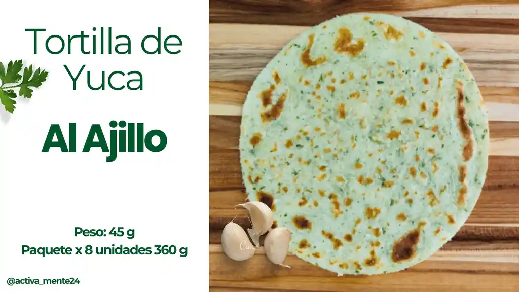 Tortilla de Yuca, Ajo y Perejill Contenido: 8 Unidades x 45 g Peso: 360 gramos. (Alimento Congelado)