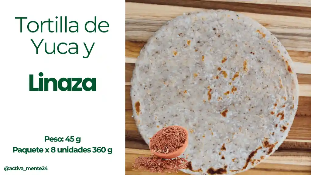 Tortilla de Yuca y Linaza Contenido: 8 Unidades x 45 g Peso: 360 gramos. (Alimento Congelado)