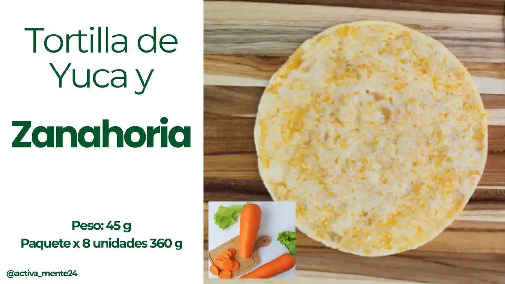 Tortilla de Yuca y Zanahoria Contenido: 8 Unidades x 45 g Peso: 360 gramos. (Alimento Congelado)