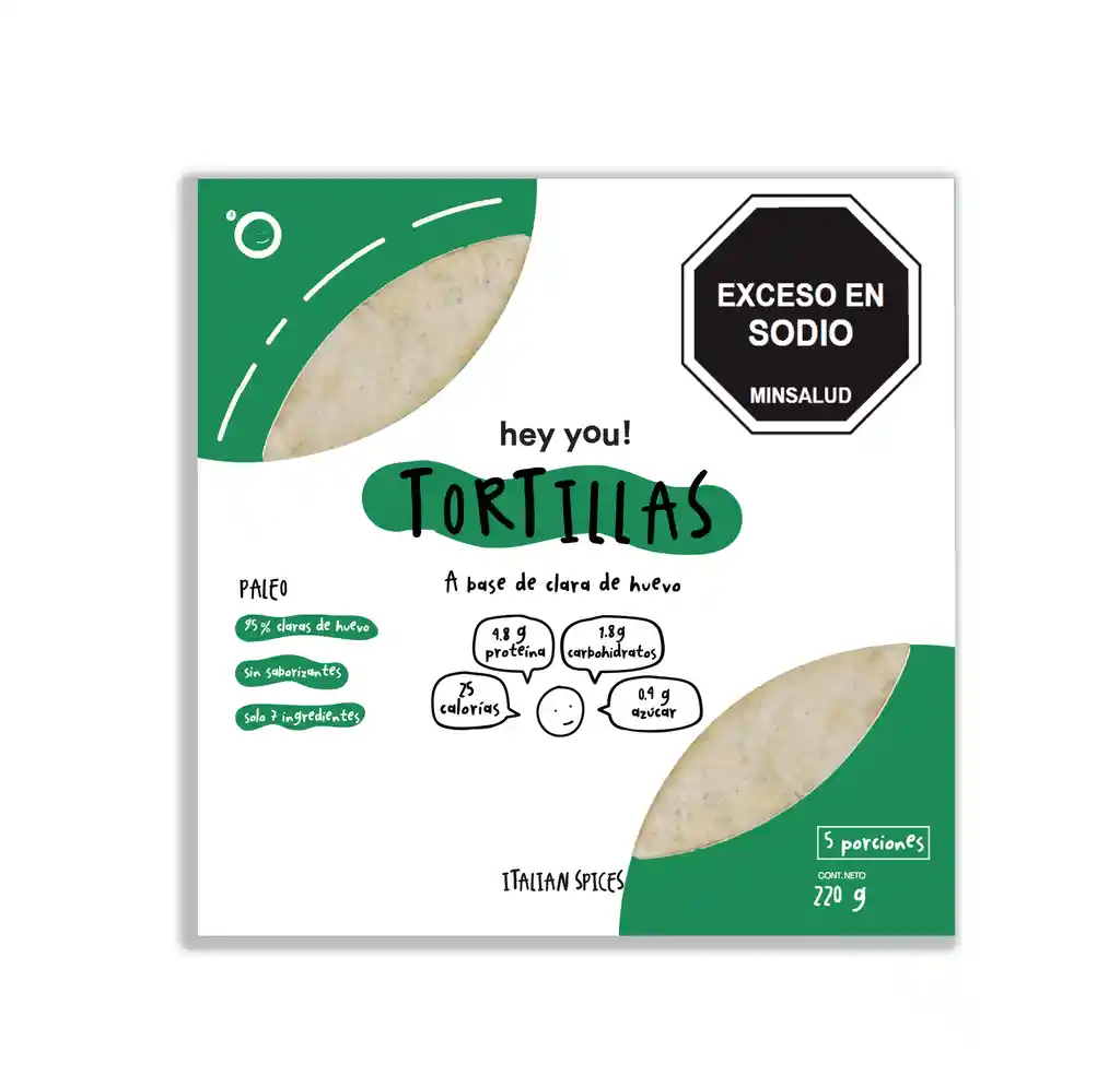 Versión saborizada con orégano, albahaca, ajo y paprika. Elaboradas con 95% claras de huevo. Sin harinas y sin azúcares añadidos. Su perfil nutricional es de 25 calorías, 4.8 g de proteína y 1.9 g de carbohidratos por unidad. Perfecta para pizzas, bruschettas y recetas con un marcado toque italiano.
