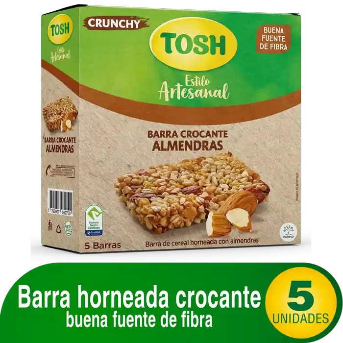 Barra de cereal horneada con almendras. Solo 110 calorías, sin conservantes ni colorantes, buena fuente de fibra, naturalmente libre de colesterol y grasas trans. Ideal para disfrutar a cualquier hora del día. Es deliciosa.