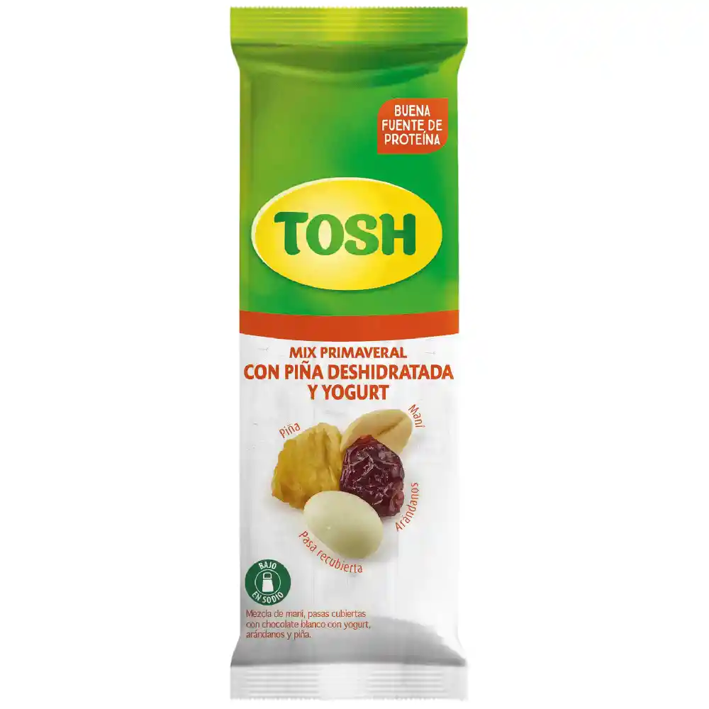 Es una combinación de piña deshidratada, marañón, maní y pasas cubiertas con chocolate blanco con yogurt. Una mezcla perfecta, buena fuente de proteína, libre de sodio y 0% colesterol. packing: Bolsa