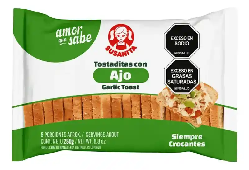 Disfrute de las Tostadas Susanita Con Ajo, presentadas en una bolsa de 250 gramos. Estas tostadas de pan tienen un sabor característico a ajo, ofreciendo una textura crujiente y un aroma tentador. Son ideales para acompañar el desayuno o la merienda, y perfectas para untar con quesos, patés, o para servir con sopas y ensaladas. Su formato en bolsa las mantiene frescas y crujientes, listas para consumir directamente desde el empaque. Una opción práctica y sabrosa para incluir en su alimentación diaria, ofreciendo la calidad y sabor característico de la marca Susanita con el distintivo sabor del ajo. ______________________________________________________ ________ Somos QUICK MART Comercializadora y Distribuidora de productos Nacionales e Importados, calidad garantizada 100% original. Dentro de nuestro portafolio de productos podrás encontrar licores (debidamente estampillados), alimentos, dulces, productos de aseo y mucho más de acuerdo a tu necesidad. Estamos ubicados en la ciudad de Bogotá, por medio de MERCADO ENVÍOS hacemos despachos a nivel nacional, si compras antes de la 14pm por MERCADO FLEX entregamos el mismo día (aplica solo para Bogotá), en horario extendido hasta las 10 p.m. Invitamos a nuestros clientes a visitar nuestra tienda virtual en MercadoShop con las mismas garantías de Mercado Libre, allí podrás conocer todo nuestro catálogo y encontrar promociones que solo aplican en nuestra tienda virtual. Las imágenes utilizadas son de referencia y por lo tanto la presentación del producto puede variar en el momento del despacho, el producto es el mismo ya el empaque depende de cada proveedor. ______________________________________________________________