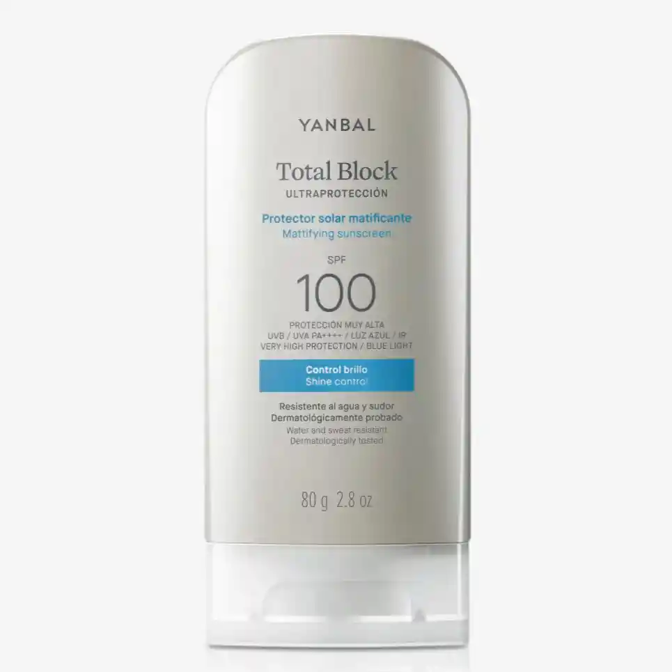 Total Block SPF 100 Matificante - Yanbal (80 g) Protección extrema con acabado mate profesional. El protector solar número 1 de Yanbal, ahora en su versión matificante. Diseñado especialmente para quienes buscan una protección muy alta contra el sol, pero prefieren un rostro libre de brillo y grasa. Su fórmula de última tecnología actúa como un escudo invisible que protege y cuida tu piel. ¿Por qué es el favorito en cuidado facial? Triple Protección: Protege contra los rayos UVA (envejecimiento), UVB (quemaduras) y la Luz Azul de pantallas y dispositivos. Efecto Anti-Brillo: Su textura ligera se absorbe al instante, dejando la piel suave, seca al tacto y con un acabado mate perfecto. No Grasoso: Fórmula libre de aceites (Oil-free), ideal para pieles mixtas a grasas o para usar debajo del maquillaje. Resistente al Agua y Sudor: Perfecto para el uso diario, actividades al aire libre o deporte. Beneficios Clave: SPF 100: Máxima categoría de protección solar disponible. Hidratación Inteligente: Mantiene la humedad de la piel sin aportar grasa. Dermatológicamente Probado: Seguro para pieles sensibles. Modo de uso: Aplica una cantidad generosa en el rostro y cuello 15 minutos antes de la exposición solar. Reaplica cada 2 horas si estás bajo sol intenso o después de nadar.
