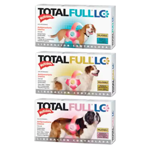 DESCRIPCIÓN: Antiparasitario interno oral de liberación controlada en comprimidos birranurados palatables. PRESENTACIÓN: Total Full LC perros chicos y medianos: Envase conteniendo 1 blister por 2 comprimidos birranurados palatables para perros hasta 10 kg y 20 kg respectivamente.