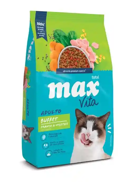 Total Max Vita Buffet Frango Vegetais para gatos adultos, garantiza una alimentación 100% balanceada con ingredientes de alta calidad que garantizan una excelente digestibilidad que mostrará heces firmes y sin olor. Con Max Vita tu mejor amigo estará siempre activo para disfrutar más momentos De Pelos.