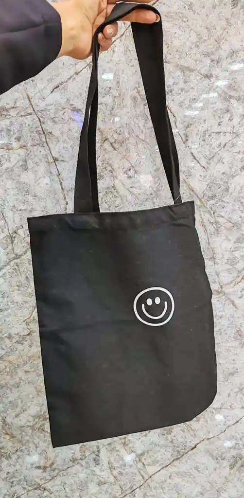 Bolso tipo tote elaborado en lona textil resistente, de acabado mate. Su diseño minimalista en color negro se complementa con un detalle bordado de carita sonriente, que aporta un toque moderno, sutil y juvenil sin perder elegancia. Es un bolso liviano pero firme, pensado para el uso diario.