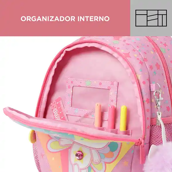 ¡Llena de Color y Magia Tus Días Con Este Morral Mediano! Está Estampado en la Parte Frontal Con Apliques Tornasolados y Piezas en Peluche Cuenta Con un Compartimiento Principal Con Cierre en Cremallera y Doble Slider Compartimento en el Frente Con Organizador de Esferos y Además Incluye Llavero en Forma de Corazon en Peluche.