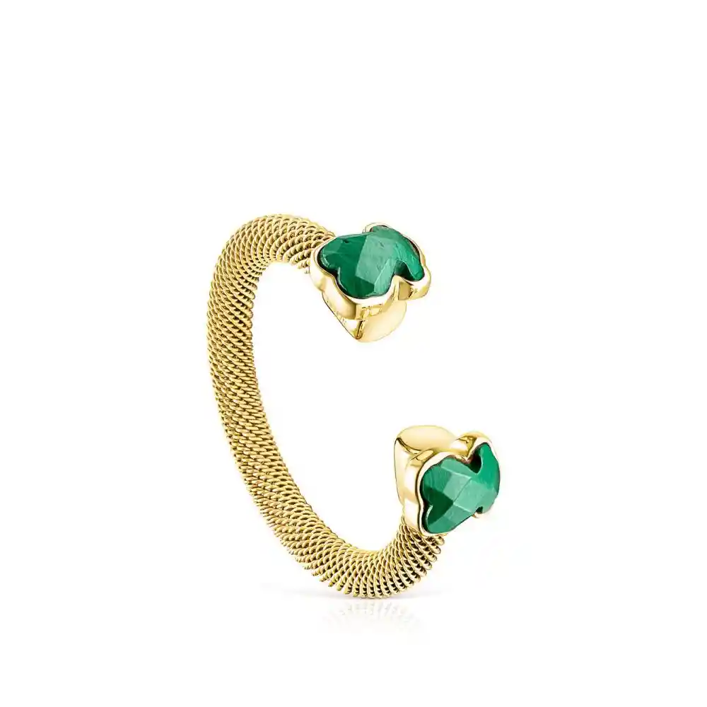 Anillo abierto TOUS Mesh Color de acero IP dorado con dos osos de malaquita y bisel de plata vermeil. Tamaño del oso: 0,6 cm. Ancho del anillo: 3 mm. Plata de primera ley recubierta de oro de 18kt con un espesor de 3 a 5 micras