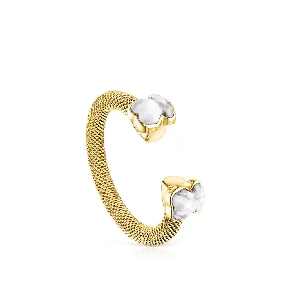Anillo abierto TOUS Mesh Color de acero IP dorado con dos osos de howlita y bisel de plata vermeil. Tamaño del oso: 0,6 cm. Ancho del anillo: 3 mm. Plata de primera ley recubierta de oro de 18kt con un espesor de 3 a 5 micras