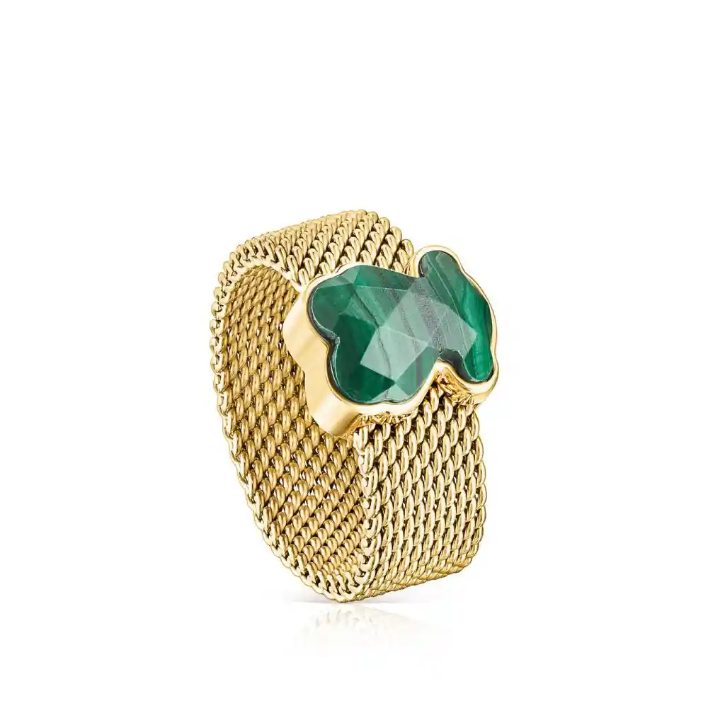 Anillo TOUS Mesh Color de acero IP dorado con oso de malaquita y bisel de plata vermeil. Tamaño del oso: 1,1 cm. Ancho del anillo: 8 mm. Plata de primera ley recubierta de oro de 18kt con un espesor de 3 a 5 micras