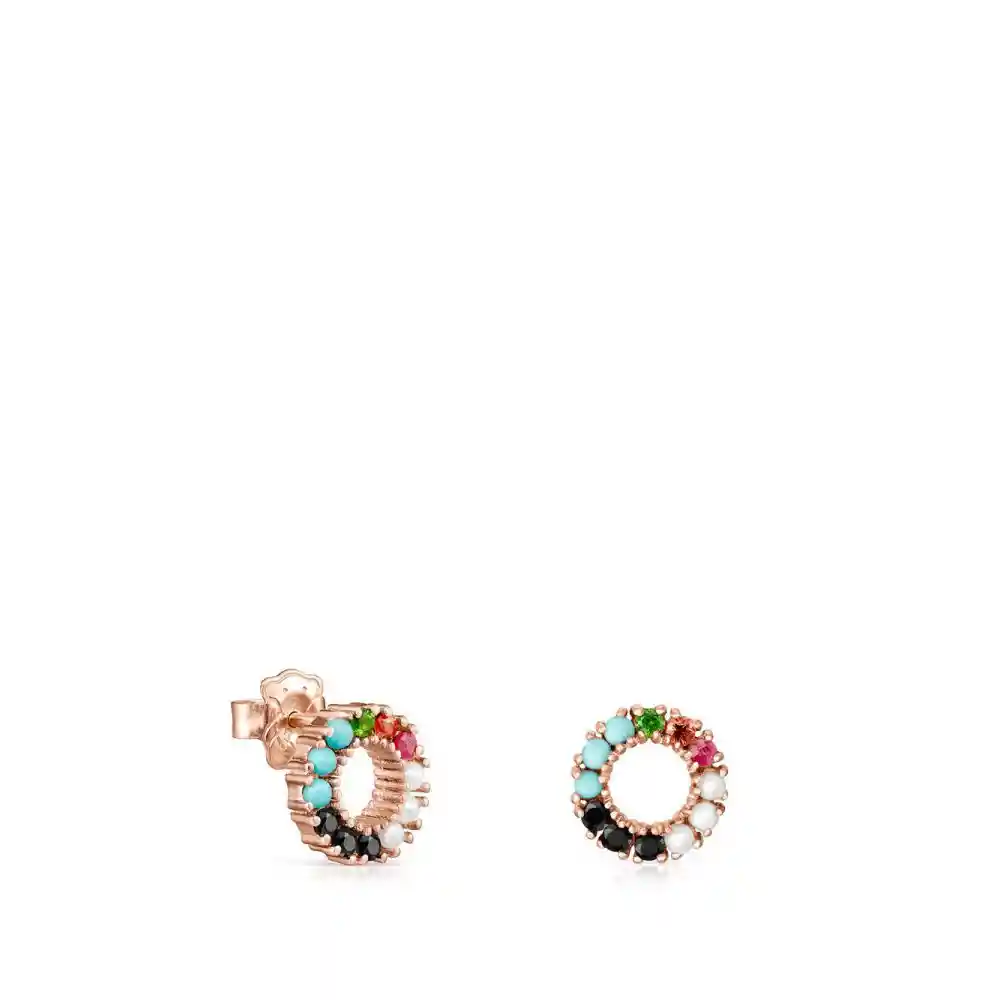 Pendientes pequeños TOUS Straight disco de plata vermeil rosa con espinelas, turquesas, perlas, rubí, zafiro naranja y tsavorita. Cierre presión. Tamaño de los pendientes: 1 cm. Plata de primera ley recubierta de oro de 18kt