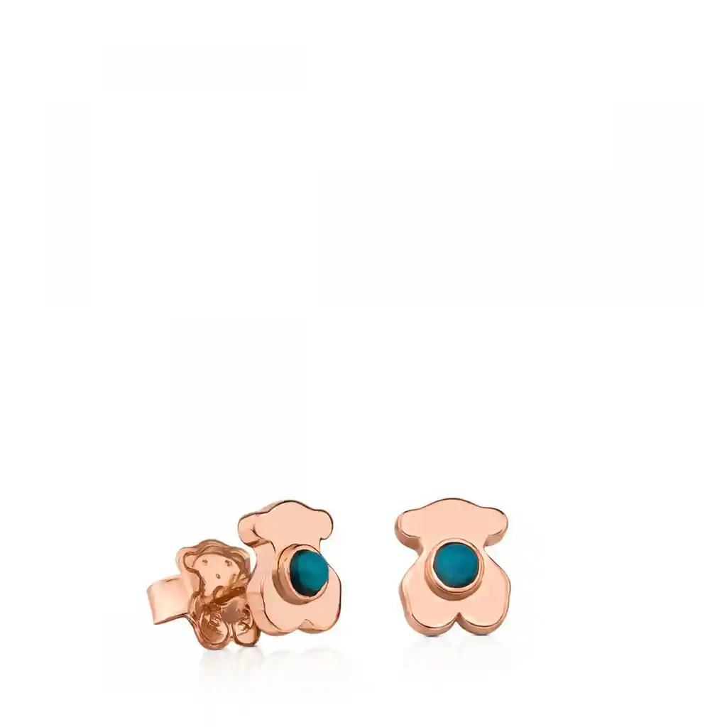 Pendientes TOUS Super Power de plata vermeil rosa con turquesas. Cierre presión. Motivo: 0,8 cm. Plata de primera ley recubierta de oro de 18kt con un espesor de 3 a 5 micras y sin ningún otro metal entre ambos.