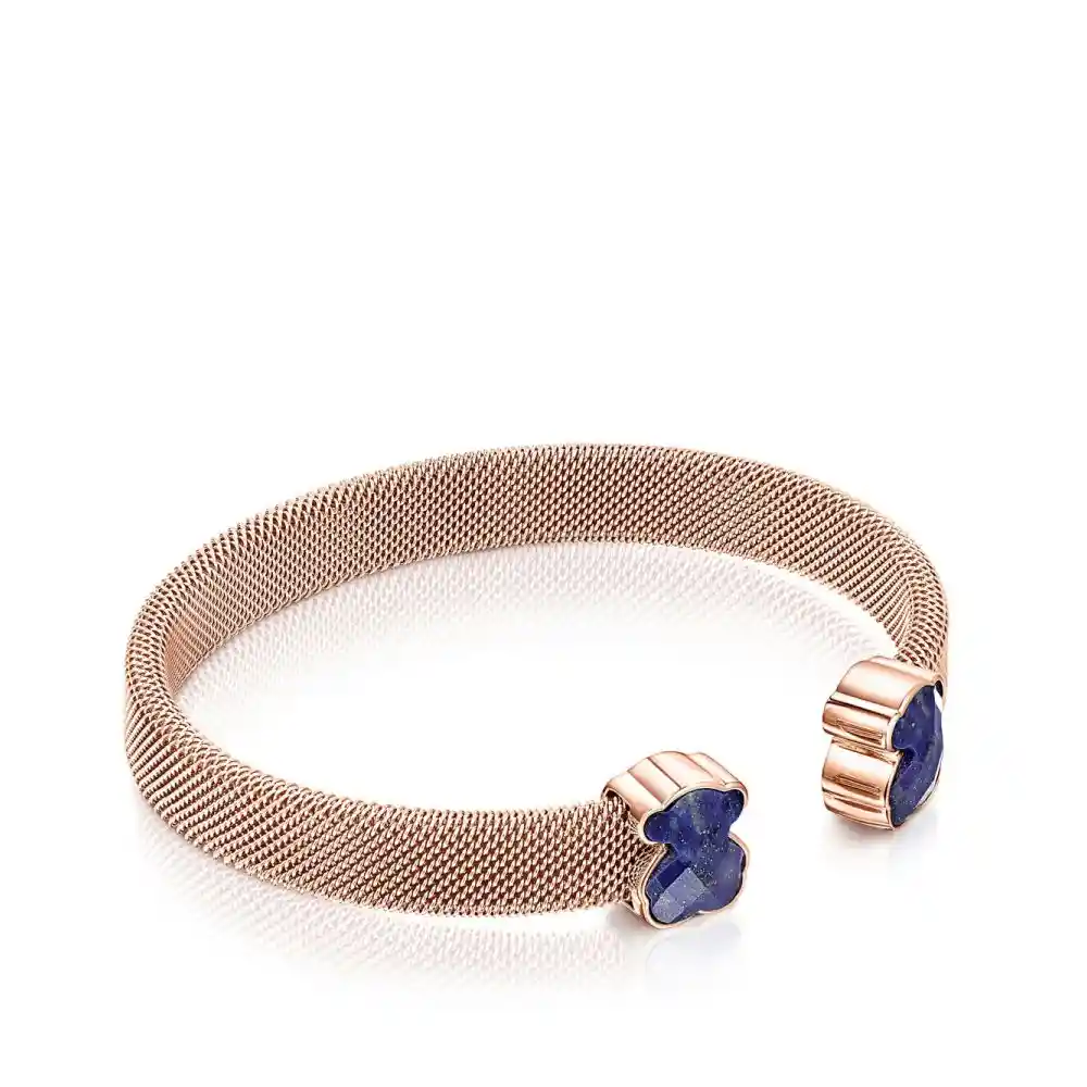 Esclava TOUS Mesh Color de acero IP rosado con dos osos de lapislázuli y bisel de plata vermeil rosa. Tamaño del oso: 1,1 cm. Ancho de la esclava: 8 mm. Plata de primera ley recubierta de oro de 18kt con un espesor de 3 a 5 micras