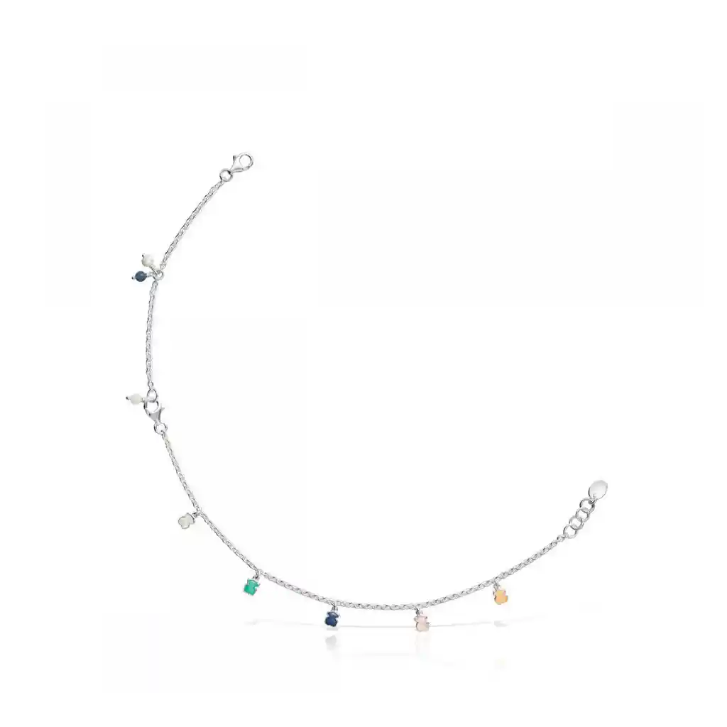 Pulsera/Tobillera TOUS Mini Color de plata de primera ley con cinco osos de cuarcita naranja, cuarcita rosa, cuarzo con dumortierita, amazonita, nácar y perla. Alargador de 8,5 cm para tobillera. Largo: 17,5 cm - 26 cm.