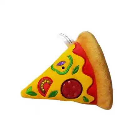 Este divertido juguete de peluche para mascotas tiene la forma de una rebanada de pizza, confeccionada con una suave tela amarilla que representa el queso y un borde acolchado en color beige para la corteza. El diseño incluye detalles bordados y coloridos que simulan ingredientes como pepperoni, rodajas de tomate y hojas verdes, lo que le da un aspecto llamativo y simpático. Es un accesorio ligero, ideal para que los perros o gatos jueguen a morder, atrapar o simplemente acurrucarse.