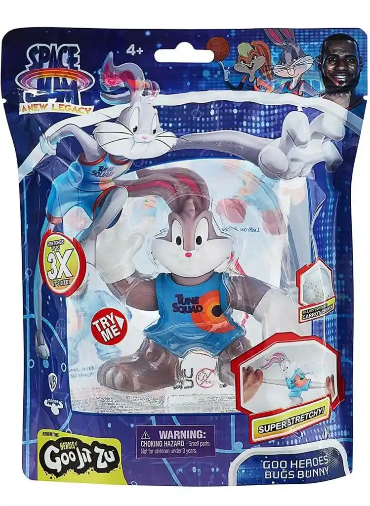 Lleva toda la acción en la cancha de Space Jam: un nuevo legado a tu hogar con estos Space Jam: A New Legacy Goo Heroes Estira y aprieta esta increíble figura de acción llena de Goo de 5 pulgadas de Bugs Bunny Bugs Bunny se estira hasta 3 veces su tamaño Estira y aprieta los insectos para ver su relleno especial de "zanahoria crujiente" en el interior