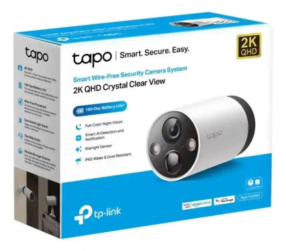 REQUIERE HUB PARA SU FUNCIONAMIENTO Inteligente. Segura. Sencilla. Instalalación flexible con la batería de larga duración Sistema de Cámaras de Vigilancia Wi-Fi Inteligente Batería de larga de duración de 180 días La batería recargable y removible con protocolo de baja potencia puede extender en gran medida su tiempo de uso. La vida útil de la batería es de hasta 180 días basada en los testeos de laboratorio de TP-Link con 10-20 eventos por día. La vida útil actual de la batería puede variar basándose en la configuración del dispositivo, uso y factores ambientales. TP-Link Tapo C420, Cámara de seguridad wifi Ip Fija Sin cables 2K QHD IP65 Grabación de Vídeo 2K QHD. Videos y fotos con alta resolución 2560 × 1440 px. Batería de larga duración 180 días(1). Recargable dos veces al año. Visión nocturna a todo color. Alta calidad de imagen y colores nítidos incluso de noche. Detección AI de movimiento con notificaciones. Identifica personas, mascotas y coches, y notifica a los usuarios según sea necesario. Instalación sin cables. Batería incorporada para colocar las cámaras en cualquier lugar. Alarma con luz y sonido. Activa al detectar un comportamiento sospechoso. Sonido bidireccional. Comunicación a través del micrófono y altavoz integrados. Almacenamiento seguro. Vídeos en tarjeta microSD(2) de hasta 256GB o servicios de almacenamiento en la nube Tapo Care(3). Resistente al agua y al polvo IP65. Sellado frente al agua y el polvo. Batería de Larga Duración hasta 180 Días La batería recargable y extraíble dura con un consumo reducido. La duración de la batería se basa en las pruebas de laboratorio de TP-Link que activan de 10 a 20 eventos por día. La duración real puede variar según la configuración del dispositivo, el uso y los factores ambientales. Imágenes nítidas 2K QHD Resolución 2560 × 1440 px, 1,7 veces más píxeles que cámaras con resolución 1080p. Visión nocturna a todo color Imágenes a todo color incluso con poca luz. Sensor Starlight Captura imágenes en condiciones de poca luz. Detección Inteligente de Movimientos Identifica personas, mascotas y vehículos, notificando cuando detecta movimientos. Alarma con luz y sonido Salta automáticamente para disuadir amenazas al detectar movimientos. Instalación en cualquier lugar Sin cables, tanto en interior como en exterior. Audio bidireccional Hablar con mascotas o personas desde cualquier lugar. Areas de detección Notificaciones al detectar actividad en zonas específicas. Almacenamiento Seguro Videos en MicroSD (hasta 256GB) o en la nube. Protección IP65 al agua y al polvo Sellado para resistir las inclemencias del tiempo. Fácil Configuración con la App Tapo (requiere Hub Tapo, no incluído) Control total con la aplicación para móviles ESPECIFICACIONES CÁMARA Sensor de Imagen: 1/3“ Resolución: 2K QHD (2560 x 1440 px) Lentes: F/NO: 1.61±10%; Focal Length: 3.18mm±5% Ángulo de Visión: 113° Visión nocturna: 850 nm IR LED up to 49 ft/15m AUDIO Comunicación de audio: Audio bidireccional Entrada y salida de audio: Micrófono y altavoz incorporados. RED Protocolo Wi-Fi: IEEE 802.11b/g/n, 2.4 GHz Protocolo: TCP/IP, ICMP, DNS, https, TCP, UDP Frecuencia: 2.4 GHz Seguridad Inalámbrica: WPA/WPA2-PSK NOTIFICACIONES DE ACTIVIDAD Notificación de entrada: Detección de movimiento, Detección de personas, Detección de mascotas, Detección de vehículos. Notificación de salida: Notificación, Captura de pantalla (Tapo Care), Clips (Tapo Care). AMBIENTE Temperatura de funcionamiento: -20ºC ~ 45ºC (-4°F ~ 113°F) Temperatura de almacenamiento: -20ºC ~ 60ºC (-4°F ~ 140°F) Humedad de funcionamiento: 10% ~ 90% de humedad relativa, sin condensación Humedad de almacenamiento: 5% ~ 90% de humedad relativa, sin condensación. CONTENIDOS DEL PAQUETE Tapo C420 Cámara (Batería incluida) Adaptador USB Cable adaptador USB Tornillos de montaje Plantillas de montaje Soportes de cámara Guía de inicio rápido HARDWARE Botón de la cámara: Botón de reinicio/sincronización LED indicador de la cámara: LED indicador del sistema Entrada del adaptador de la cámara: 100-240V, 50/60Hz Salida del adaptador de la cámara: 5.0V, 1.0A Dimensiones de la cámara (An. x Pr. x Al.): 4.35 x 2.52 x 2.52 pulgadas (110.6 * 64.2 * 64.2 mm) VÍDEO/IMAGEN Compresión de Vídeo: H.264 Resolución y Tasa de Frame: 15/20 fps Streaming de Vídeo: 2K QHD
