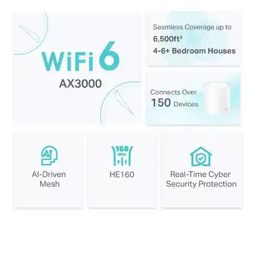 Tp-link, Sistema Wifi 6 Malla Para El Hogar, Deco X50 (3-pack) • AX3000 WiFi de doble banda : WiFi 6 súper rápido con velocidades de hasta 3.0 Gbps • 4 flujos, menos retraso - 2×2/HE160 2402 Mbps + 2×2 574 Mbps • Velocidad con cable Gigabit : 3 puertos Gigabit proporcionan suficiente conectividad • Cobertura continua mejorada: cobertura WiFi de malla continua de hasta 6500 ft2 (paquete de 3) • TP-Link HomeShield : brinda protección integral de la red, controles parentales sólidos y protección IoT en tiempo real WiFi de malla superior , en todas partes . Sistema WiFi 6 en malla para todo el hogar AX3000 EXCELENTE CONECTIVIDAD POR CABLE E INALÁMBRICA Disfrute de una transmisión 4K fluida, juegos en línea y videollamadas en toda su casa. Obtén Wi-Fi 6 ultrarrápido con velocidades de hasta 3,0 Gbps y 3 puertos Gigabit Ethernet que brindan velocidades warp por cable. RENDIMIENTO WIFI SUPERIOR Deco X50 presenta velocidades WiFi más altas, mayor capacidad de dispositivo y casi ningún retraso con un ancho de banda de canal HE160 más amplio. MALLA WIFI 6 ULTRARRÁPIDA Armado con la tecnología WiFi 6, el WiFi en malla para todo el hogar de Deco está diseñado para brindar un gran impulso en cobertura, velocidad y capacidad total. Súbete al último WiFi en malla para disfrutar de la red del futuro que se carga más rápido y se conecta más. • Capacidad 4 veces mayor • Velocidad 3 veces más rápida • 1024-QAM • HE160 • Duplicación de ancho de banda • Compatible con versiones anteriores COBERTURA PARA TODO EL HOGAR: WIFI DEAD ZONE KILLER Con señales más claras y fuertes mejoradas por BSS Color y Beamforming, Deco X50 aumenta la cobertura Wi-Fi de toda la casa con un gran rendimiento. Las conexiones inalámbricas y el backhaul Ethernet opcional funcionan juntos para vincular las unidades Deco, proporcionando velocidades de red aún más rápidas y una cobertura verdaderamente perfecta. ¿Quieres más cobertura? Simplemente agregue otro Deco. MALLA IMPULSADA POR IA: SIEMPRE APRENDIENDO, OPTIMIZANDO CONSTANTEMENTE Armado con AI-Driven Mesh, Deco X50 ofrece WiFi inteligente que lo sigue dondequiera que esté, sin interrupciones. Aprende automáticamente su entorno de red, la calidad del cliente y los comportamientos de los usuarios. Los algoritmos sofisticados tienen en cuenta varios factores para que Deco X50 proporcione WiFi de malla ideal, único para su hogar. Camine por su casa y disfrute de una transmisión continua a las velocidades más rápidas posibles. ROAMING SIN PROBLEMAS CON UN NOMBRE WIFI TP-Link Mesh significa que las unidades Deco trabajan juntas para formar una red unificada. Su teléfono o tableta se conecta automáticamente al Deco más rápido a medida que se mueve por su hogar, creando una experiencia WiFi verdaderamente perfecta. DEJE QUE LOS EXPERTOS ASEGUREN SU HOGAR Personalice su red doméstica con seguridad mejorada utilizando el kit de funciones integradas de TP-Link HomeShield. Ya sea que esté identificando brechas de seguridad en la red, limitando el tiempo que sus hijos pasan en línea o bloqueando sitios web, HomeShield le brinda las herramientas que necesita para administrar completamente su red.* CONFIGURACIÓN RÁPIDA CON LA APLICACIÓN DECO Desembale Deco, instale la aplicación y luego simplemente siga las instrucciones en pantalla. La aplicación Deco se encargará del resto, poniendo su red en funcionamiento en minutos. 1. Conecte Deco a su cable módem y encienda ambos dispositivos 2. Descargue e inicie la aplicación Deco simplemente siga las instrucciones en la aplicación para finalizar los pasos de configuración. 3. Para el próximo Deco, simplemente enciéndalo para unirse automáticamente a la red. WI-FI FÁCIL Gestión fácil Administre su WiFi en casa o fuera en la aplicación Deco, incluida la visualización de todos los dispositivos conectados, la priorización de los suyos propios, la configuración de una red de invitados y más. Control de voz Empareje con Alexa para controlar Deco X50 con simples comandos de voz. Disfruta de la vida conveniente. Todos los Decos trabajan juntos Deco X50 es compatible con todos los demás modelos de Deco para formar una red de malla. Amplíe la cobertura WiFi en malla en cualquier momento simplemente agregando más Decos. MÁS QUE UN ROUTER, FUNCIONAL Y BONITO El diseño en blanco puro, simple pero envolvente, evoca un estado de ánimo invernal o un brillante día de verano. Deco X50 con un cuerpo delicado lo hace perfecto para combinar con varias decoraciones del hogar. TECNOLOGÍA DE MALLA TP-LINK ASESINO DE ZONA MUERTA WI-FI Elimine las áreas de señal débil con una sola red Wi-Fi que cubra todos los rincones de su hogar con roaming continuo, enrutamiento adaptable y recuperación automática. Ya no tendrás que buscar una conexión estable, ya sea que estés en el sótano, en el garaje o en el jardín. ____________________________________________________ INALÁMBRICO Estándares WiFi 6 • IEEE 802.11ax/ac/n/a 5 GHz • IEEE 802.11ax/n/b/g 2,4 GHz Velocidades: WiFi AX3000 • 5 GHz: 2402 Mbps (802.11ax, HE160) • 2,4 GHz: 574 Mbps (802.11ax) Rango WiFi: Casas de 4-6+ habitaciones (paquete de 3) • Tecnología TP-Link Mesh El backhaul Ethernet opcional funciona en conjunto para vincular las unidades Deco y brindar una cobertura perfecta • AI-Driven Mesh Aprende inteligentemente el entorno de la red para proporcionar Wi-Fi ideal único para su hogar • Antenas 2x (internas) Múltiples antenas forman un refuerzo de señal matriz para cubrir más direcciones y áreas más grandes Formación de haces Concentra la potencia de la señal inalámbrica hacia los clientes para ampliar el alcance WiFi Capacidad Wi-Fi: Alto • Banda dual Distribuya dispositivos a diferentes bandas para un rendimiento óptimo • 2×2 MU-MIMO Se comunica simultáneamente con múltiples clientes MU-MIMO • OFDMA Se comunica simultáneamente con múltiples clientes WiFi 6 • 4 Streams Ancho 