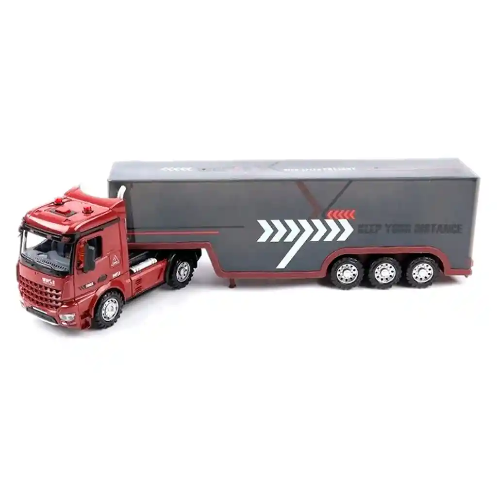 Tractomula a Control Remoto 1/16 con Contenedor – Luces, Sonido y Dirección Realista ¡Haz que la diversión ruja sobre ruedas! Esta impresionante tractomula a escala 1/16 combina diseño realista, tecnología inalámbrica y funciones interactivas para brindar una experiencia de juego envolvente y emocionante. Características destacadas: Diseño detallado: Cabina roja con remolque gris, acabados realistas y mensaje de seguridad “KEEP YOUR DISTANCE”. Control remoto 2.4 GHz: Dirección precisa con giro frontal funcional, ideal para maniobras auténticas. Luces decorativas y funcionales: Faros delanteros, luces superiores y efectos de iluminación en el remolque. Sonido integrado: Efectos sonoros que simulan el motor y ambiente de carretera. Dimensiones: Largo total de 55 cm, ideal para exhibición o juego activo. Edad recomendada: A partir de 5 años. Ideal para: Regalos de cumpleaños o navidad Coleccionistas de vehículos RC Niños y adultos apasionados por el transporte y la ingeniería Incluye: Tractomula con remolque Control remoto tipo pistola con volante Caja de presentación “LONG VEHICLE”