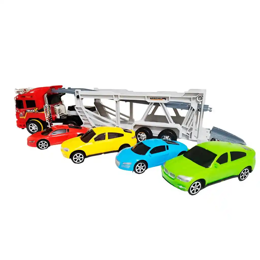 Camión transportador de autos de juguete con diseño realista que incluye cuatro vehículos de carreras, ideal para niñas y niños a partir de 3 años. Su remolque de dos niveles permite cargar y descargar los autos fácilmente mediante rampas, brindando una experiencia de juego dinámica y entretenida. Fabricado en materiales resistentes, este set estimula la imaginación, la creatividad y el juego de roles, permitiendo recrear escenarios de transporte y competencia de una manera divertida y educativa. Ficha Tecnica: Dimensiones: 52 cm x 15 cm x 7 cm Material : Plástico ABS no toxico Edad mínima recomendada : Mayores de 3 años Referencia: 710 Certificado de conformidad: E5-0359-2021 ** _Para defectos de fábrica o retractos: \_Por favor revise el producto apenas lo reciba y antes de usarlo. No aplican ley de retracto o defectos de fábrica luego de usar el producto. Se manejan máximo 5 días para reportar defectos de fábrica (por ejemplo, producto funciona mal, piezas faltantes, rotas, etc). Para hacer efectiva la devolución el producto debe devolverse con el empaque original, el cual debe estar en buen estado, incluir todos los documentos y las partes completas y sin daños.
