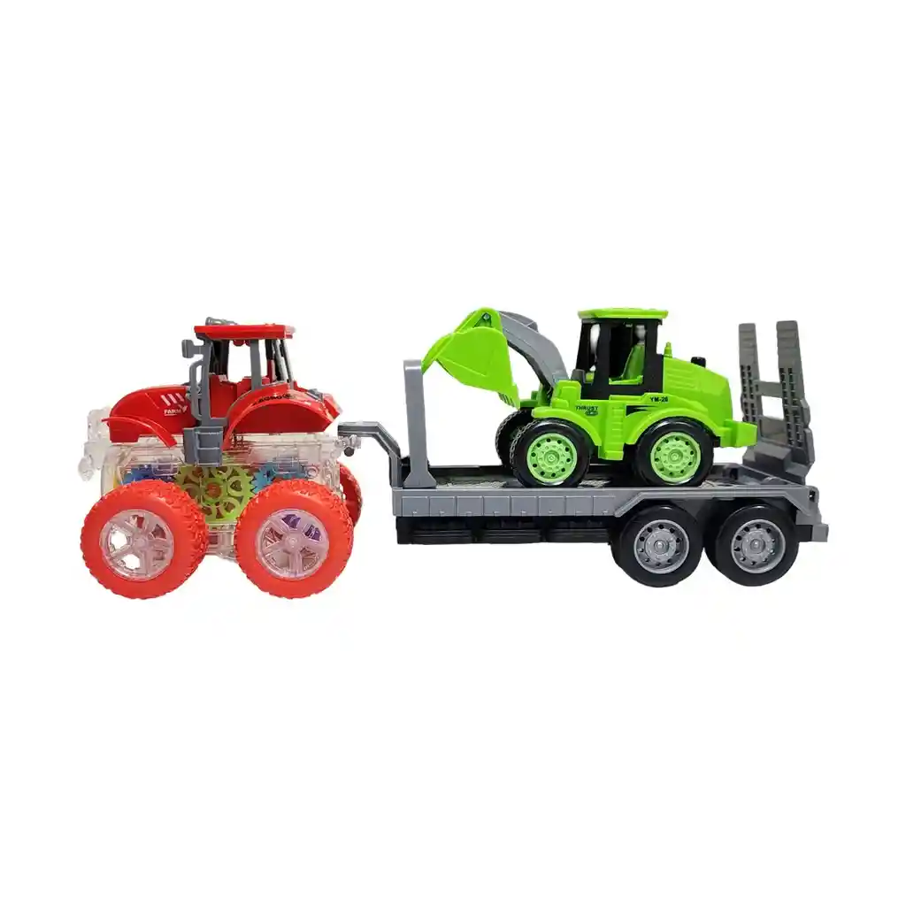 ¡Manos a la obra con este espectacular set de transporte de construcción! Un imponente tractor amarillo lidera el equipo, luciendo un increíble chasis transparente que revela un show de engranajes de colores y luces en pleno funcionamiento mientras se mueve. Engancha su resistente remolque para llevar la excavadora verde directamente a la zona de trabajo. Una vez encendido, este poderoso tractor avanza por sí solo, arrastrando la maquinaria pesada y mostrando su fascinante mecanismo interno en acción. Es el juguete 3 en 1 perfecto para el pequeño constructor en casa, combinando la fuerza de los vehículos de trabajo con un diseño dinámico que inspira horas de juego creativo y grandes proyectos. Ficha Técnica: Material: Plástico ABS Dimensiones Del Vehículo : 27 cm x 10 cm x 8 cm Apto para: + 3 Años Referencia: YM-1112T1 Certificado de conformidad: CS-LCO-13233-2021S2/432 ** _Para defectos de fábrica o retractos: \_Por favor revise el producto apenas lo reciba y antes de usarlo. No aplican ley de retracto o defectos de fábrica luego de usar el producto. Se manejan máximo 5 días para reportar defectos de fábrica (por ejemplo, producto funciona mal, piezas faltantes, rotas, etc). Para hacer efectiva la devolución el producto debe devolverse con el empaque original, el cual debe estar en buen estado, incluir todos los documentos y las partes completas y sin daños.