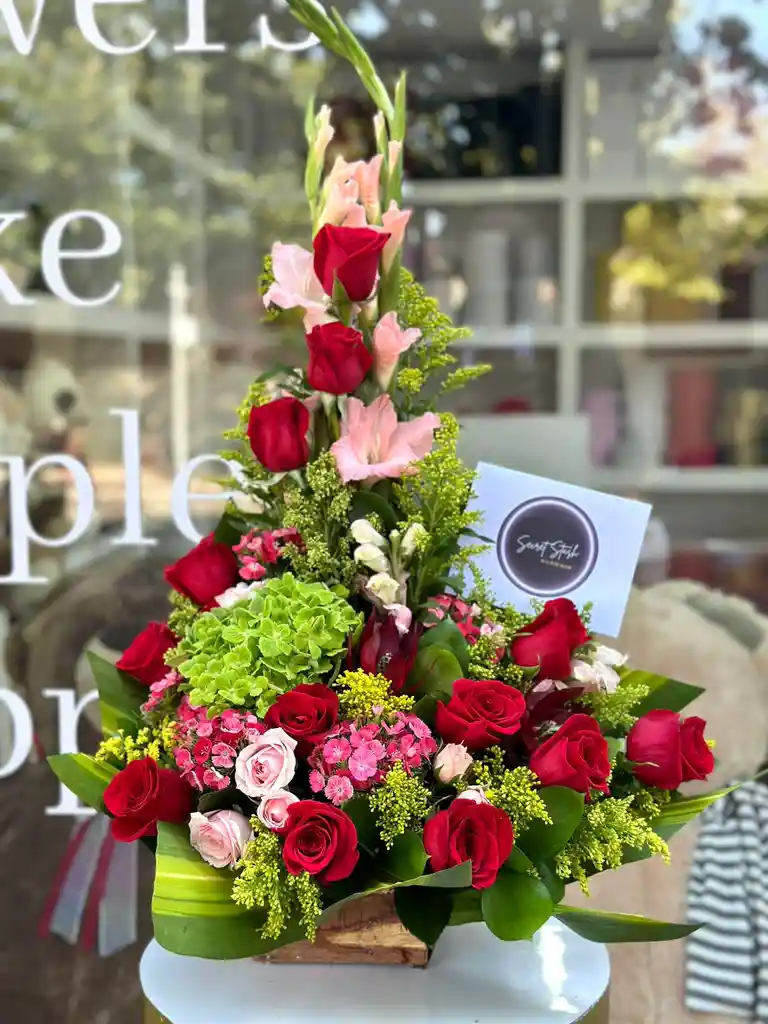 Exprese sus sentimientos con un hermoso diseño floral elaborado por Flor de Helena, con rosas frescas, clavel chino, helecho cuero, solidago amarillo, anturios, hortensia, gladíolo, hoja de dracena, en una base especial para flores artesanal.