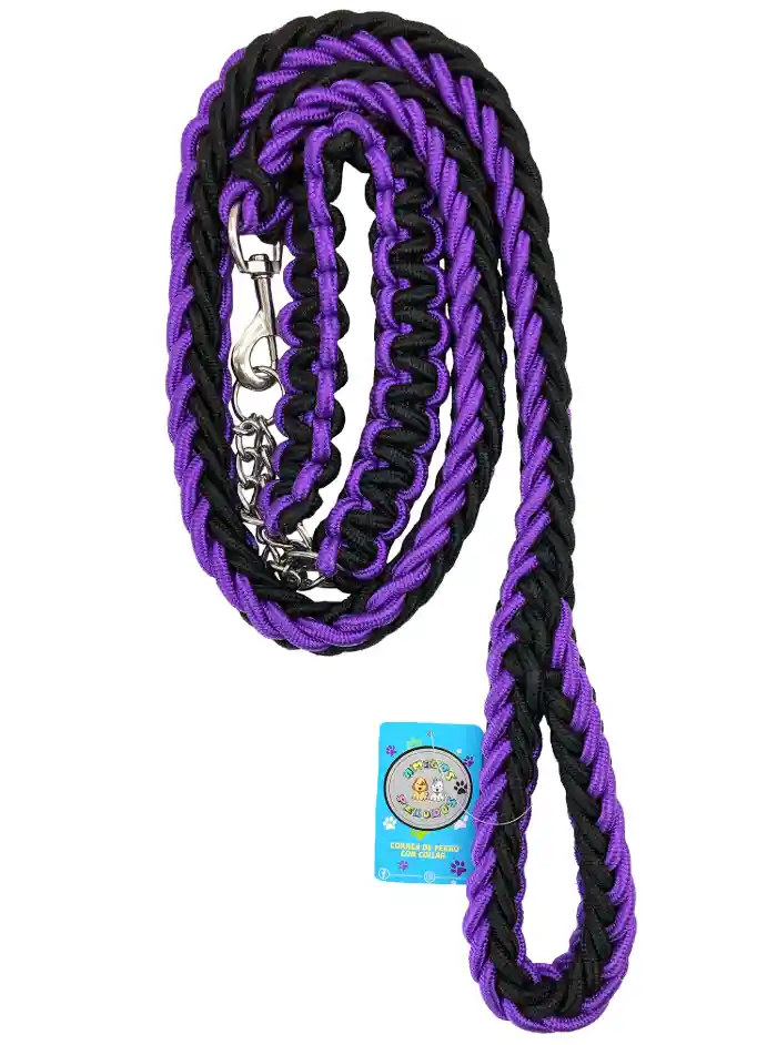 Esta es una correa para perro de alta resistencia, fabricada con un tejido grueso de cuerda tipo paracord en una llamativa combinación de colores morado y negro. Su diseño trenzado no solo le otorga una estética moderna, sino que también proporciona una durabilidad superior y un agarre cómodo para el dueño durante los paseos. Incluye un mosquetón metálico de seguridad reforzado y una sección de cadena, ideal para perros con mucha fuerza o tendencia a morder la correa, garantizando un control firme y seguro en todo momento.