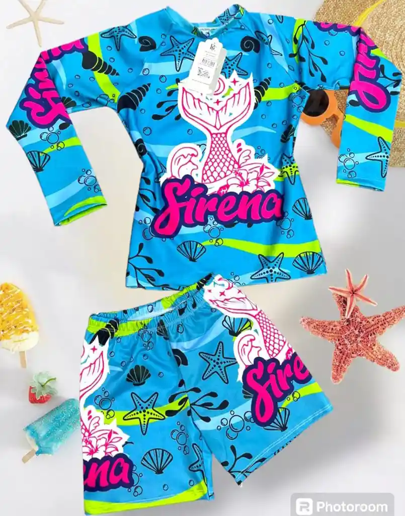 Traje de baño de dos piezas para niñas, manga larga para protegerlos del sol y pantalones de baño, tela licrada con estampado de cola de sirena para que disfruten de su mejor dia en la playa. TALLA : 10/12