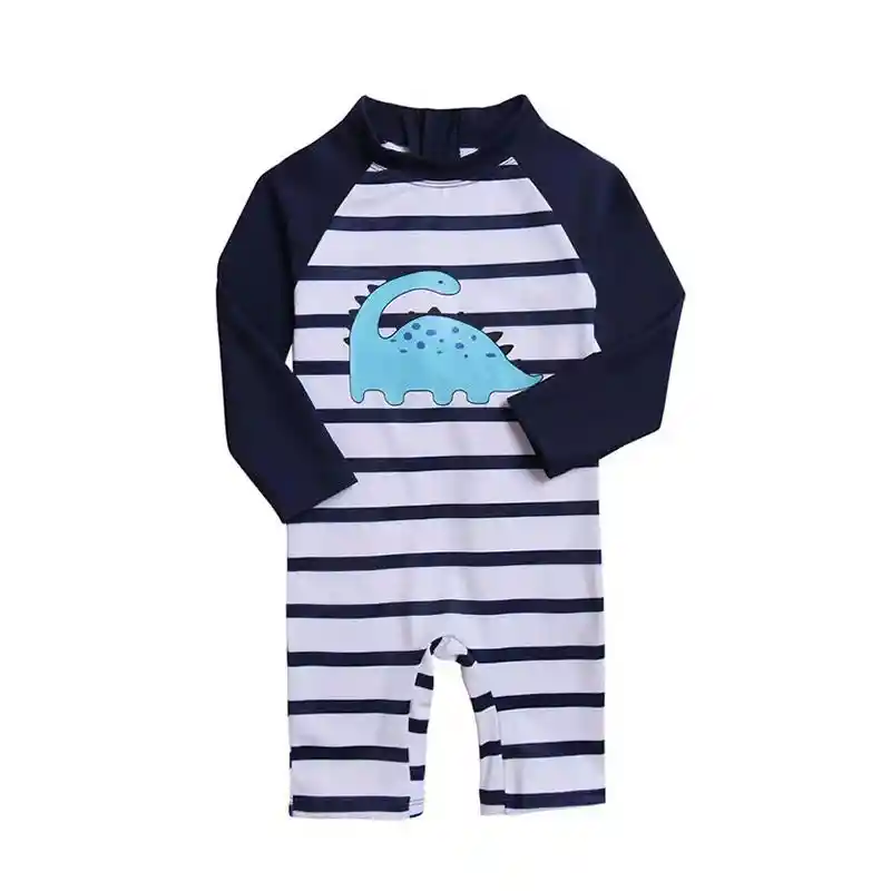 traje de baño en enterizo blanco y azul con estampado de rayas, manga larga con cierre trasero , para niño de 3 Años Material: spandex - poliéster