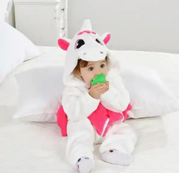 Cómodo traje enterizo fabricado en terciopelo y poliéster con diseño de Unicornio Recomendaciones de Fabrica 70CM (9-12 meses) 80CM (12-18 meses) 90CM (18-24 meses) 100CM (2-3 años)