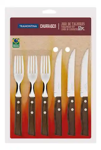 Parrilla & Barbacoa SET DE CUBIERTOS PARA ASADO, 6 CUCHILLOS Y 6 TENEDORES. El asador siempre es el último que se sienta a la mesa. Pero para garantizar que los invitados también traten al asado con respeto, nada mejor que elegir los cubiertos adecuados para eso. La línea Churrasco de Tramontina tiene mangos de madera que resisten a la intemperie y a la humedad y láminas de acero inoxidable para garantizar el corte perfecto de las carnes. Principales funciones y beneficios Láminas de acero inoxidable. Mangos de madera natural. Remaches de aluminio. Recomendaciones de uso USO SEGURO Y ADECUADO: Antes del primer uso, lave bien las piezas y séquese. Tenga cuidado al manejar productos cortantes y perforantes y manténgase fuera del alcance de los niños. Para mayor durabilidad de los cubiertos, se recomienda secarlos bien antes de guardarlos. Para el desecho de productos y embalajes, siga las orientaciones de reciclaje vigentes. Peso 0,34 kg Longitud 315 mm Ancho 220 mm Altura 35 mm Garantía Garantía por defectos de fabricación