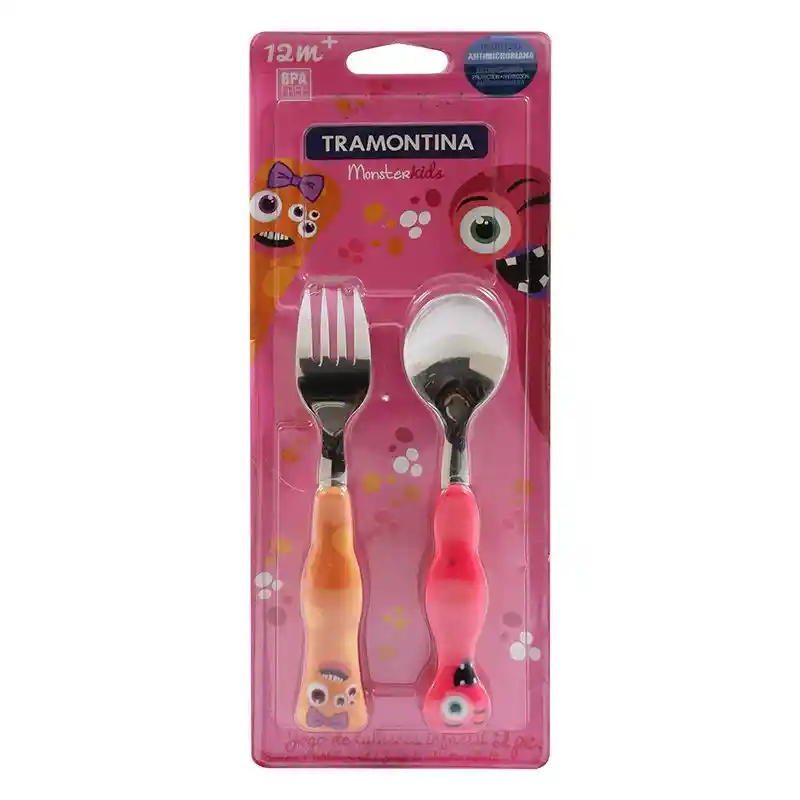 Marca: Tramontina. Modelo: 23799081. Medidas: 2 x 4 x 17 cm. Color: Rosado y Naranja. Peso: 0.2 Kg. Para niños mayores de 12 meses. Mango elaborado en poliéster. elaborados en acero inoxidable