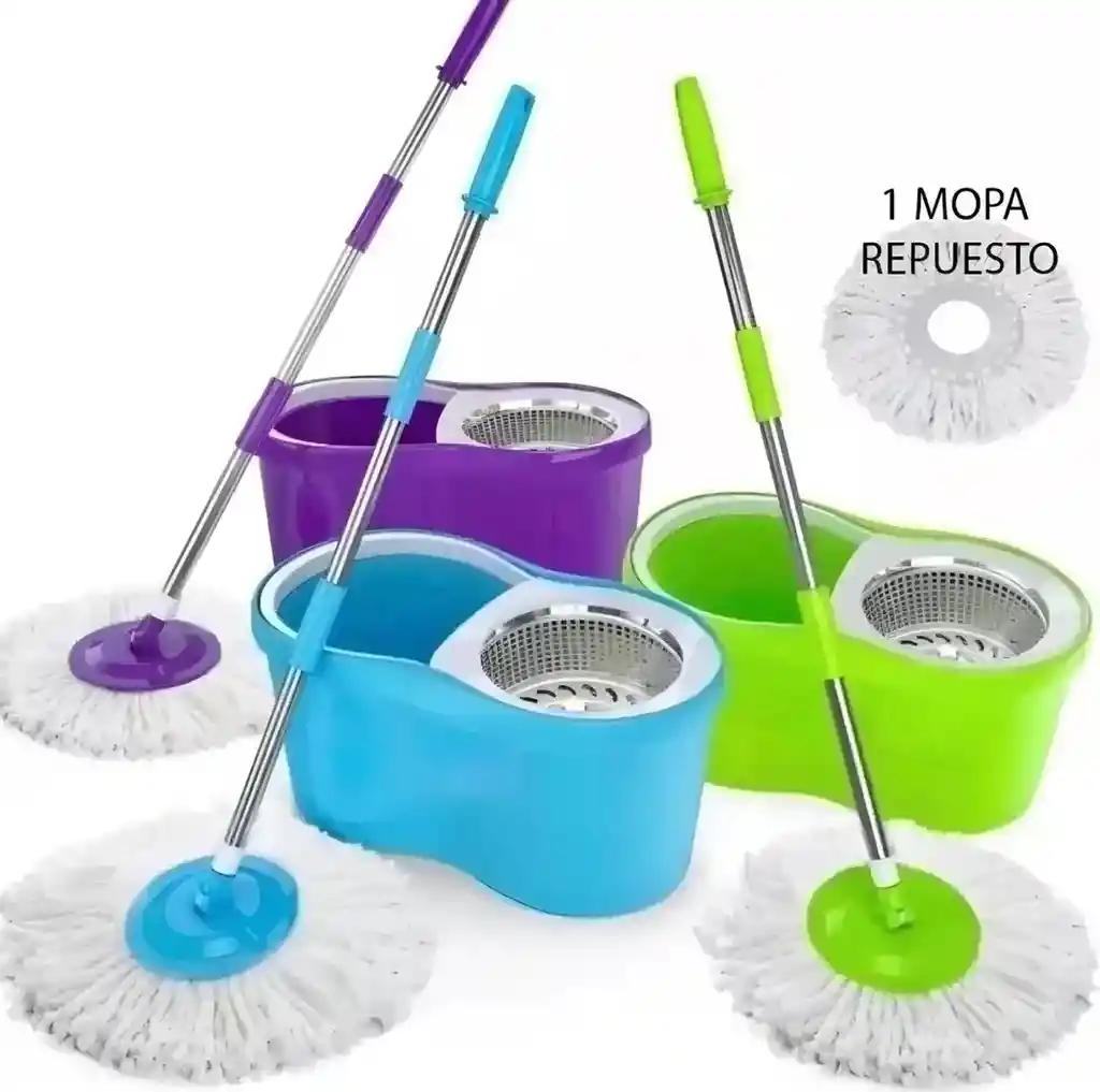 Trapeadores Giratorios (con Cubeta): Descripción: Un sistema que incluye un balde con un mecanismo de centrifugado (generalmente con pedal o a presión) que escurre el trapeador automáticamente, evitando el contacto con el agua sucia y la necesidad de agacharse. Ideal para: Limpieza profunda de áreas grandes, ya que mantiene el cabezal más limpio durante su uso.