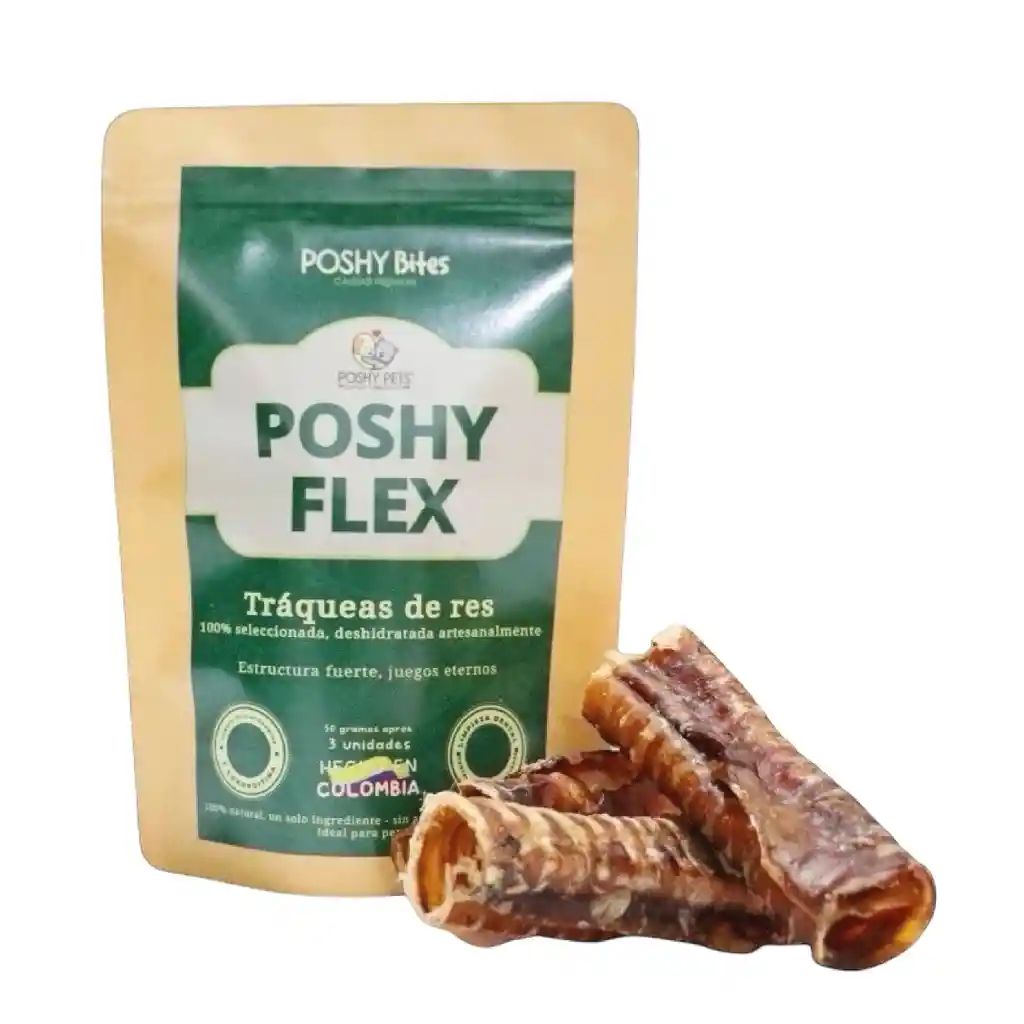 Tu peludito también merece algo natural. Resistencia y salud en cada giro. POSHY FLEX son tráqueas de res deshidratadas, ricas en cartílago natural que favorece la flexibilidad de las articulaciones. Su forma única permite una masticación prolongada que ayuda a la limpieza dental mecánica, reduciendo el sarro mientras tu mascota disfruta de un snack funcional y duradero. Beneficio Clave: Limpieza dental y cuidado de cartílagos. Origen: Fabricación Local Colombiana Ingredientes: 100% Tráqueas de Res Presentación: Doypack con cierre hermético para máxima frescura. Uso: Complemento alimenticio / Premio. Peso: 3 unidades Registro ICA: 01387002025