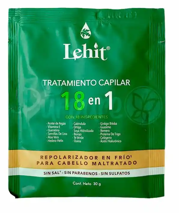 Tratamiento Acondicionador CAPILAR 18 EN 1, REPOLARIZADOR EN FRIO, CABELLO MALTRATADO - 30G Lehit, ACEITE DE ARGAN , CALENDULA GINKGO BILOBA, VITAMINA E, ORTIGA, GUASIMO, QUERATINA , SOYA HIDROLIZADA, ROMERO, SEMILLAS DE LINO, BOROJO, PROTEINA DE TRIGO, ALOE VERA, TE VERDE, COLAGENO, HEDERA HELIX, QUINA, ACIDO HIALURONICO