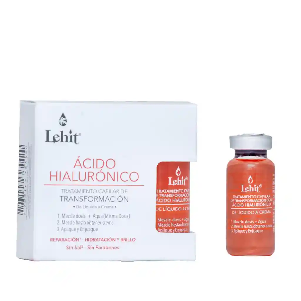 El Tratamiento Capilar de Transformación de Líquido a Crema Activada con Ácido Hialurónico de Lehit es una ampolla de 15 ml diseñada para proporcionar hidratación profunda, reparación y brillo al cabello. Su fórmula sin sal, parabenos ni sulfatos lo hace ideal para cabellos tratados químicamente o con tendencia a la sequedad. 🌿 Características Principales Transformación de líquido a crema: La ampolla se convierte en una crema ligera al aplicarla sobre el cabello, facilitando su distribución y absorción. Hidratación y reparación intensiva: El ácido hialurónico ayuda a retener la humedad en la fibra capilar, mejorando su elasticidad y reduciendo el frizz. Libre de sal, parabenos y sulfatos: Apto para todo tipo de cabello, incluyendo aquellos tratados químicamente. Uso externo exclusivo: No es un producto inyectable. Presentación: Ampolla de 15 ml. Composición: Contiene ácido hialurónico, conocido por sus propiedades hidratantes y reparadoras. Transformación única: Convierte su fórmula líquida en una crema al mezclarla con agua. Apto para: Todo tipo de cabello, especialmente aquellos secos o dañados. 🌿 Beneficios ✔ Hidratación profunda: El ácido hialurónico penetra en la fibra capilar, proporcionando una hidratación intensa y duradera. ✔ Reparación celular: Ayuda a reparar el daño estructural del cabello, restaurando su salud. ✔ Suavidad y brillo: Deja el cabello suave al tacto y con un brillo natural. ✔ Control del frizz: Reduce el encrespamiento, facilitando el peinado. ✔ Protección térmica: Ofrece una capa protectora contra el daño por calor. 🧑🔬 Modo de Uso 1️⃣ Coloque en un recipiente la dosis del producto y vierta lentamente la misma cantidad de agua mientras agita la mezcla. 2️⃣ Mezcle hasta obtener una crema suave y homogénea. 3️⃣ Aplique sobre el cabello limpio y húmedo. 4️⃣ Masajee suavemente y deje actuar de 5 a 10 minutos. 5️⃣ Enjuague con abundante agua. 📌 Precauciones 🔹 Uso externo únicamente. 🔹 Evitar contacto con los ojos; en caso de contacto, enjuagar con abundante agua. 🔹 Mantener alejado del alcance de los niños. 🔹 Conservar en lugar fresco y seco, alejado de fuentes de calor. ✅ Recomendaciones Finales Este tratamiento es ideal para quienes buscan una solución efectiva para el cuidado del cabello dañado. Su fórmula transformadora y libre de ingredientes agresivos lo hace adecuado para cabellos tratados químicamente. Además, su presentación de 15 ml es práctica para uso diario o viajes.