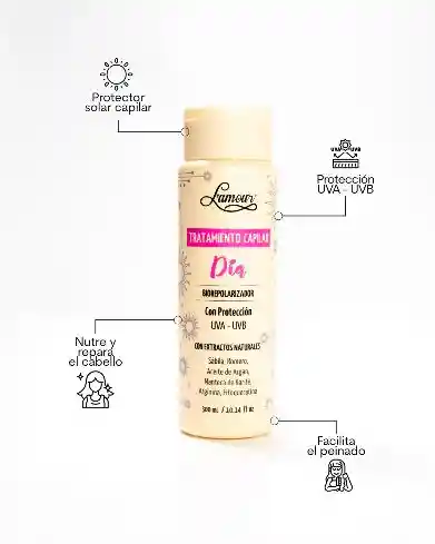El tratamiento Día es tu escudo diario contra las luces naturales y artificiales. Protege el cabello de los rayos UV, mientras lo nutre y repara intensamente, evitando la resequedad y el maltrato en tu cabello. BENEFICIOS * Protección contra los rayos UVA y UVB, ideal para todo tipo de cabello. * Ayuda a evitar la resequedad y decoloración causada por el sol. * Mantiene el cabello suave e hidratado durante todo el día. * No requiere enjuague. * Puedes usarlo como crema para peinar. IDEAL PARA: Todo tipo de cabello, graso, seco o mixto. Cabello con poca densidad, poco crecimiento y perdida. Cabello con alisado, keratina, aminoácidos, tintura o decoloraciones. FACTOR DIFERENCIAL: Protector solar capilar, no genera grasa y es apto para hacer peinados como clean look y definición del cabello, moldea sin generar peso cosmético.