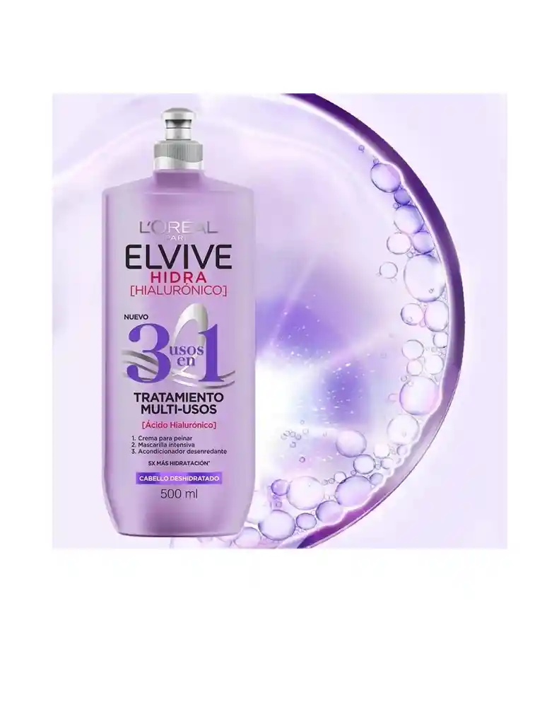Tratamiento Multiusos 3 en 1 Elvive Hidra Hialurónico con Ácido Hialurónico y sin sal para cabello deshidratado. Nuestro Tratamiento es tu aliado para 5X más hidratación sin dejar el cabello pesado, puedes usarlo para Hidratar y estilizar como una crema para peinar Transformar y suavizar como una mascarilla intensiva Aplica sobre el cabello húmedo o seco.
