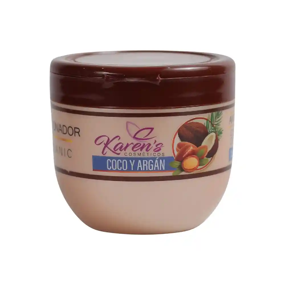 Acondicionador Coco y Argán Karen`s Cosmeticos Contiene: 350ml Bondades: - ANTIFRIZZ - CUIDADO CAPILAR Es un acondicionador-reconstructor profundo, Ideal para cabellos dañados y secos, extremadamente maltratados y deshidratados. Es un potente tratamiento de acondicionamiento que revitaliza y fortalece el cabello mientras extiende su vitalidad; sus ingredientes penetran hasta la cutícula aportándole nutrientes, acondicionando y depositando complejos de proteínas y pigmentos adicionales en el cabello, dando brillo, suavidad e hidratación.