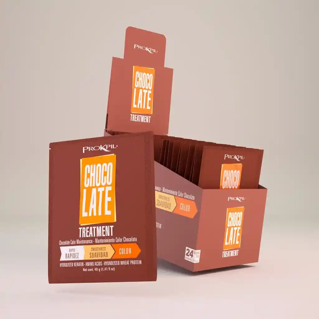Tratamiento color Chocolate Mantiene el color del cabello teñido, evitando que aparezcan los tonos de desgaste, que se generan por los lavados o exposición al ambiente, al mismo tiempo que mejora la hidratación, el brillo y la suavidad del cabello. Esta línea está compuesta por 9 colores, creados como una solución a los diferentes tonos de tinturas. APLICA PARA RUBIOS Esperar de 2 a 10 minutos. (A mayor altura menos tiempo y a menor altura más tiempo) MODO DE USO Lava el cabello con Shampoo Color Care o Cenizo de Prokpil, retira con abundante agua, eliminar el exceso de agua con la toalla, aplica el tratamiento color de acuerdo al tono mechón a mechón para lograr una aplicación uniforme. APLICA PARA DEMÁS TONOS Esperar de 10 a 15 minutos. Retirar con abundante agua. Repetir cada tercer lavado.