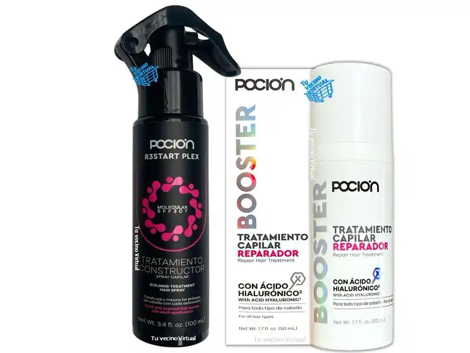 En tu vecino virtual también encontraras : Anyeluz, syam cosmetic, piel de oro, Kaba, class gold, lampiña, Te verde de matcha Benefit, te plus, te latte, te negro, exfoliante, aceite de coco, pomada alfa, colageno hidrolizado,vinipel osmótico, Bioaqua Acne, Mascarillas,tónico, Trendy, la pocion, HGW y muchos mas ————————————————————————————————————————————————— BOOSTER - Tratamiento Capilar Reparador Booster es el tratamiento todo en uno que tu cabello necesita para hidratar, fortalecer y proteger en un solo paso. Su avanzada tecnología de lípidos, combinada con ácido hialurónico, permite que los ingredientes activos penetren profundamente, maximizando la absorción de nutrientes y ofreciendo resultados visibles en solo 2 minutos. Úsalo solo para una hidratación intensa, protección avanzada y control del frizz, o mézclalo con mascarillas, tratamientos y cremas para peinar para potenciar sus beneficios y acelerar sus efectos. Con Booster, tu cabello se verá más brillante, fuerte y saludable en menos tiempo. Modo de uso: lava el cabello con tu shampoo habitual y enjuágalo bien. Mezcla 5 push de Booster con tu producto preferido en la palama de la mano y aplícalo sobre el cabello húmedo. Deja actuar 2 minutos, enjuaga y peina como de costumbre. También puedes usar nuestro Booster sin mezclar, aplicando 5 push directamente sobre el cabello húmedo o seco y opta por dejarlo o enjuágalo según tu preferencia. Contenido: 50 mL ———————————————————————————————————— Tratamiento Constructor Instantáneo La POCION Nuestro Spray Reconstructor Capilar Inmediato de R3START PLEX es una avanzada emulsión que trabaja construyendo los puentes artificiales de disulfuro para transformar cabellos dañados, quebradizos, sin fuerza y sin elasticidad. Con su fórmula de alto rendimiento, devuelve al instante fuerza, suavidad y brillo, incluso en cabellos ultra procesados. Ideal para revitalizar cabellos fundidos y altamente maltratados, R3START PLEX reduce la porosidad y fortalece cada hebra, logrando una apariencia visiblemente renovada desde la primera aplicación. MODO DE USO: Divide tu cabello en secciones, luego sobre el cabello húmedo o seco atomiza de raíz a puntas a una distancia aproximada de 20 cm. Para mejores resultados distribuye de manera uniforme con ayuda de tus manos o un peine. Aplica en cualquier momento del día. No requiere enjuague. Contenido 100 mL