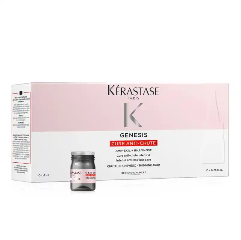 Tratamiento Estimulante y Anti Caída contra el Debilitamiento Capilar Genesis Kérastase Ampolletas, creadas para combatir la caída del cabello causada debilitamiento y quiebre de la fibra capilar. gracias a sus ingredientes como el aminexil, ayuda a mantener la densidad del cabello, la fibra capilar estará mas fuerte (con menos rotura) y con aspecto saludable, eficacia anti-caída y como resultado un re- anclaje de la raíz de la fibra capilar al cuero cabelludo. Un cabello mas fuerte, mas suave, saludable y un cuero cabelludo equilibrado y protegido de factores externos agresivos. BENEFICIOS Y CARACTERISTICAS DEL PRODUCTO Detiene la caída del cabello y restaura su estructura de la fibra capilar. Fortalece el cabello desde la raíz (re-anclaje de la raíz al cuero cabelludo). Mejora la resistencia y reduce el quiebre (menos rotura). Favorece para tener un cuero cabelludo saludable. Cabello más fuerte, con mayor densidad y revitalizado. Contiene células madre de edelweiss, con propiedades antioxidantes, son capaces de soportar las condiciones más extremas. Estimula el crecimiento de cabello nuevo por su contenido de extracto de jengibre. Aroma floral-cítrico fresco y vigorizante. Contiene 10 ampollas (6 ml cada ampolla) INGREDIENTES Aminexil: Reconocido por ayudar a reducir la caída y generar un anclaje dela raíz del cabello al cuero cabelludo.Rhamnose: Azúcar de origen natural presente en plantas, que estimula un cuero cabelludo más saludable. CONSEJO DE USO Aplicar una ampolleta sobre el cuero cabelludo limpio y seco o ligeramente húmedo. Distribuir sección por sección y masajear suavemente. No enjuagar. Usar de forma continua según recomendación (generalmente 1 ampolla diaria o varias veces por semana).