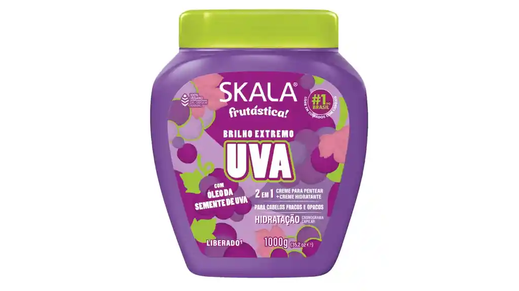 🟣 Tratamiento Skala Frutástica Uva – 1000g ¡El favorito para dejar tu cabello suave, brillante y lleno de vida! ✨💜 El Tratamiento Skala Frutástica Uva está elaborado con extracto de uva y otros ingredientes nutritivos que ayudan a revitalizar, hidratar y fortalecer el cabello desde la raíz hasta las puntas. Su fórmula ligera y vegana lo convierte en una opción perfecta para uso diario, dejando el cabello con una sensación fresca, manejable y con un aroma frutal irresistible. 🍇🌿 🌟 Beneficios 🍇 Hidratación profunda gracias al extracto de uva. 💪 Fortalece y revitaliza el cabello débil o sin vida. ✨ Aporta suavidad y brillo natural desde el primer uso. 🌀 Facilita el desenredo y reduce el frizz. 🌱 100% vegano y libre de ingredientes de origen animal. 🧴 Textura ligera que no deja el cabello pesado. 💜 Ideal para: ✔ Cabello seco o maltratado ✔ Cabello con frizz ✔ Rutinas de hidratación frecuente ✔ Todo tipo de rizos y ondas 📌 Modo de uso Aplica sobre el cabello limpio y húmedo, distribuyendo de medios a puntas. Déjalo actuar entre 3 a 15 minutos dependiendo del nivel de tratamiento que desees. Enjuaga bien y disfruta de un cabello suave, fresco y con aroma delicioso. ✨💆♀️